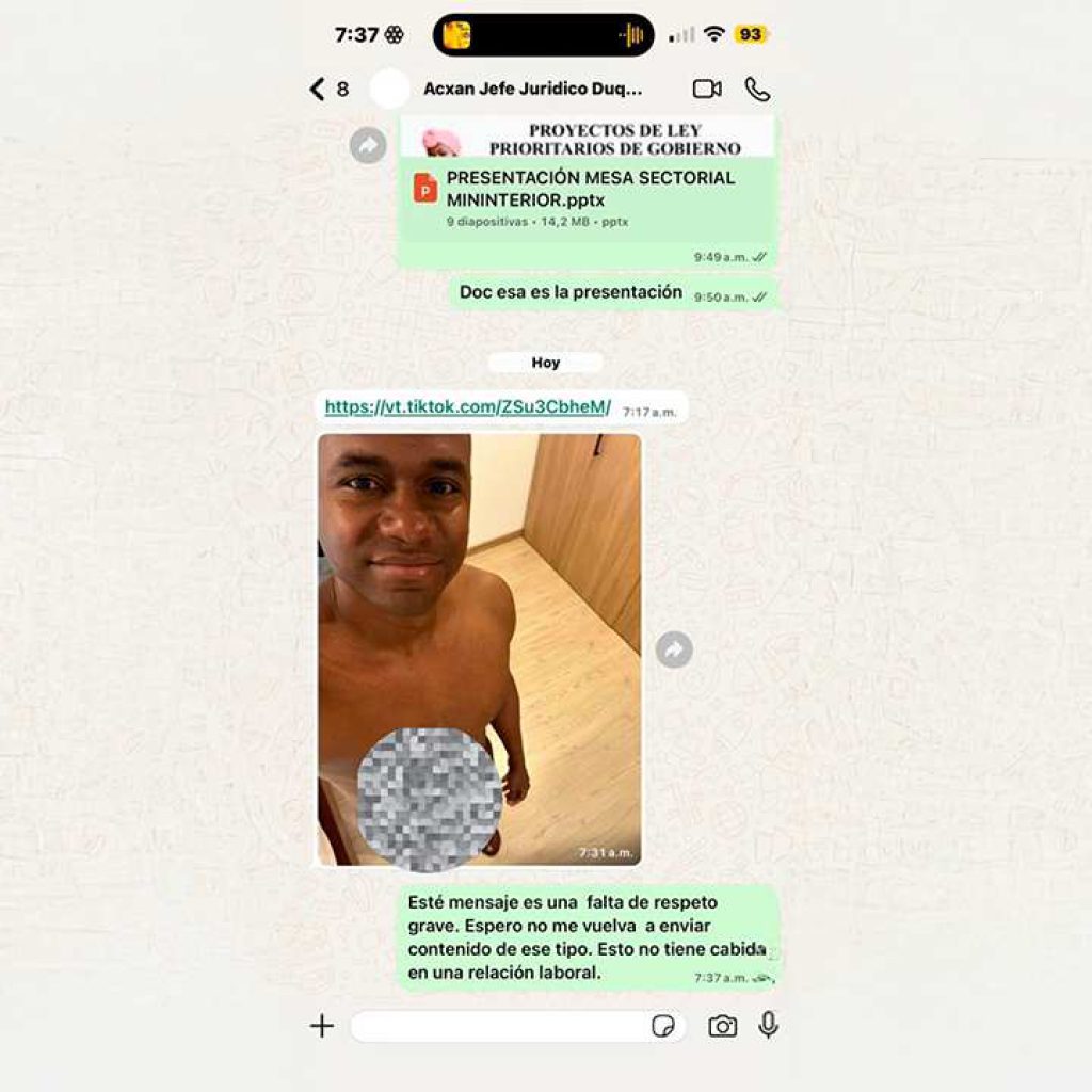 El viceministro encargado del Ministerio de la Igualdad, Acxan Duque, renunció a su cargo tras conocerse una denuncia por presunto acoso sexual en su contra. Según la queja radicada ante el Comité de Convivencia de esa cartera, el funcionario habría enviado a través de WhatsApp una fotografía de contenido sexual a una subalterna sin su consentimiento. Duque ejercía, además, como encargado de la Oficina Jurídica del ministerio.
